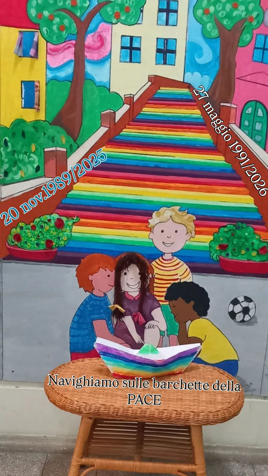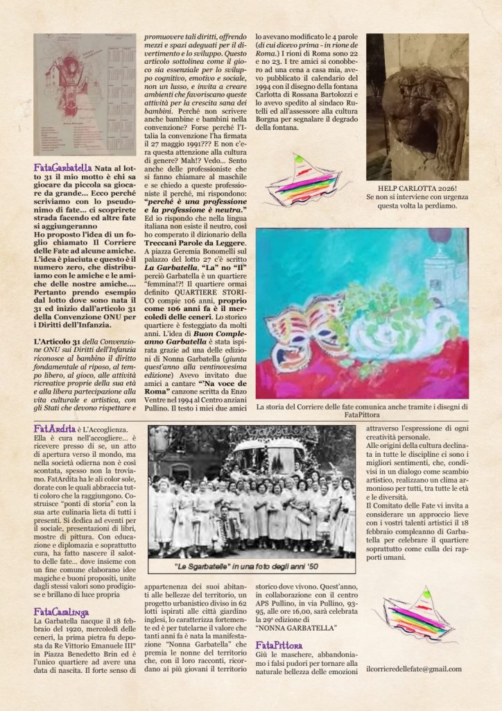27 maggio 1991/2024 33 anni fa l’Italia firmó la convenzione ONU per i diritti dell’infanzia e dell’adolescenza, tra questi diritti il piú importante è quello di nascere e crescere in un mondo senza guerre.Come ogni anno Fatagarbatella ricorda questa dara importante con la scuola materna della Coccinella del presso Cesare Battisti con una passeggiata per le strade del quartiere narrando la Garbatella in fiaba. La fiaba ogni anno è inedita ideata da fata Garbatella., La fiaba inizia la sua costruzione ogni 18 febbraio data della prima pietra deposta dal Re. Grazie all’aiuto delle maestre le bambine ed i bambini quest’anno hanno colorato il disegno che riproduce il palazzo della scuola con vari personaggi delle fiabe.Oltre al disegno della scuola Cesare Battisti hanno colorato un sommergibile chiamato Giacinto Pullino.Fatagarbatella è tornata il 27 Maggio per la passeggiata direzione fontana Carlotta ed ha narrato chi fosse veramente Giacinto Pullino. GIACINTO era un uomo di mare che pilotava i sottomarini e c’è una strada a Garbatella che porta il suo nome, proprio su quella via c’è un parco chiamato caduti nel mare. Molti anni fa ci fu una guerra dove morirono tanti marinai, uno era nato proprio alla Garbatella. Per questo noi dobbiamo gridare forte viva viva la PACE e scrivere una nuova fiaba per la PACE nel Mondo. La passeggiata è stata guidata da due vigilesse con due bacchette magiche come quelle che Fatagarbatella ha donato si bambini e bambine.La cosa più bella è stata quella di incontrare alla fontana un bambino di 94 anni di nome Pietro che andava alla stessa scuola di questa bella infanzia garbatellana, anche a lui è stata fondata una bella bacchetta realizzata con materiale di riuso.